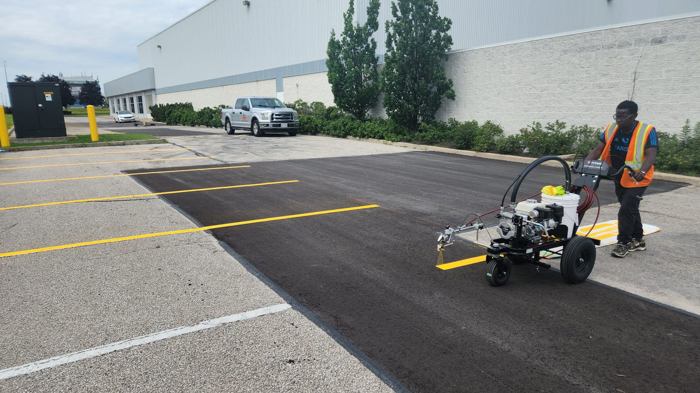 This project focuses on pavement maintenance and improvement, including line painting, asphalt repairs, and power sweeping. The images feature worker using machine for line painting on pavement, worker painting parking lot lines with machine, and person cleaning large flat surface with power washer.
